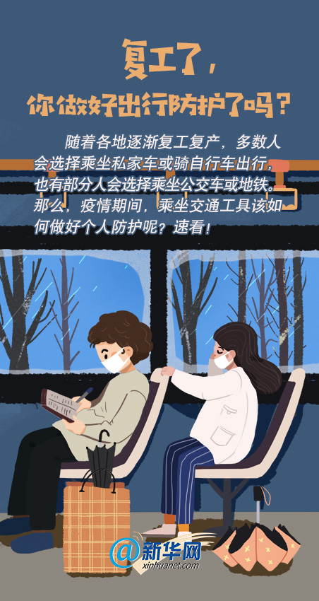 复工了,你做好出行防护了吗? 2020-04-02 09:13 0 随着各地逐渐复工复产,多数人会选择乘坐私家车或骑自行车出行,也有部分人会选择乘坐公交车或地铁。那么,疫情期间,乘坐交通工具该如何做好个人防护呢?速看! 文字综合整理新华网、人民网。 来源:新华网 责编:雷奥琳