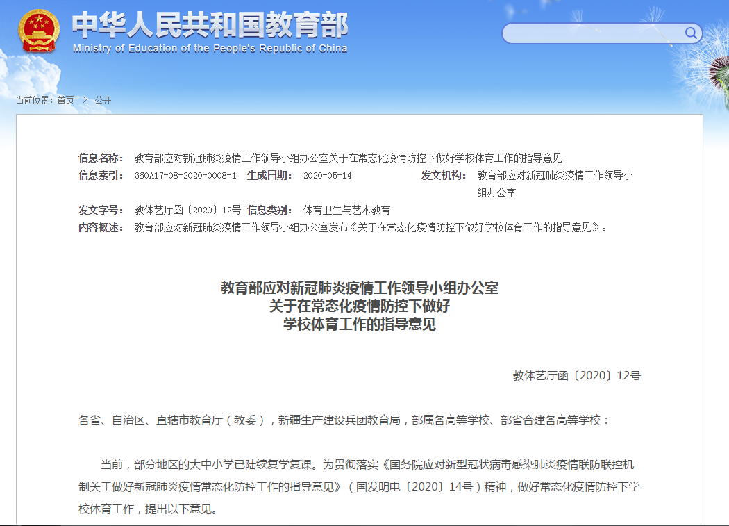近日,教育部应对新冠肺炎疫情工作领导小组办公室发布《关于在常态化疫情防控下做好学校体育工作的指导意见》