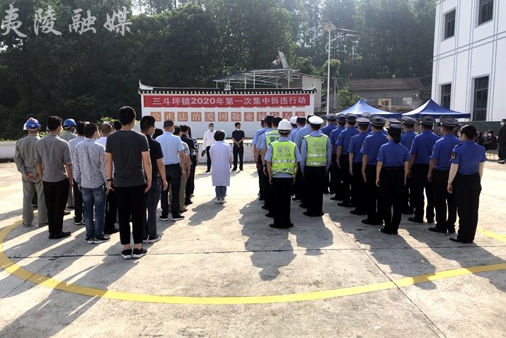 拆除现场,三斗坪镇政府联合区综合执法局三斗坪分局、三斗坪派出所、三斗坪规环所等部门,出动50余名执法人员,对高某、陶某等人位于三斗坪镇东岳庙村三组原东岳庙市场附近的17处违法建筑物进行了拆除,合计占地面积800.02平方米,合计建筑面积922.17平方米,并协助违建当事人高某、陶某拆除违建钢架棚162.71平方米。