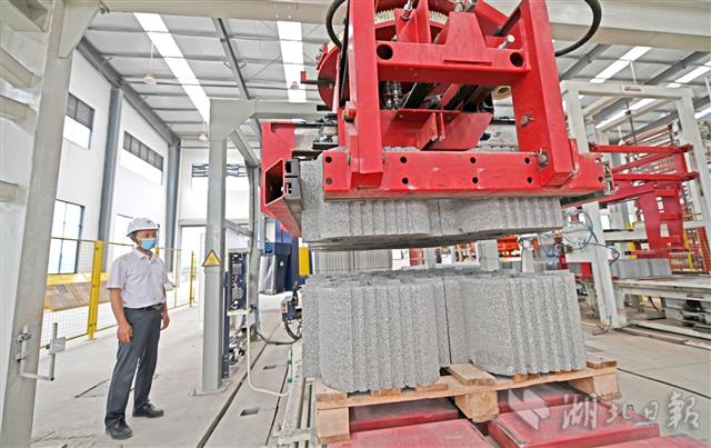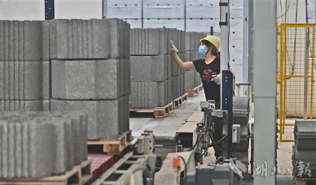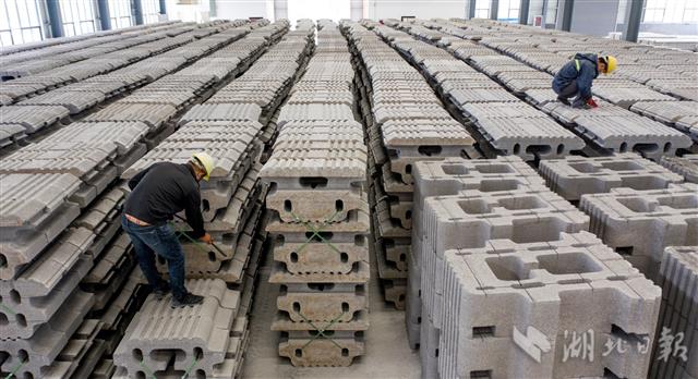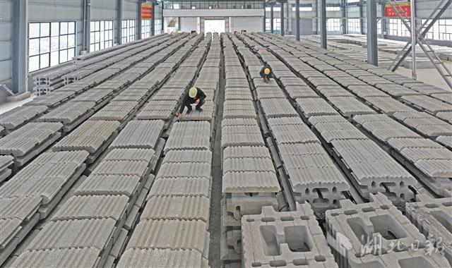 5月25日,宜昌市夷陵区龙泉小微创业园,昌耀新材料股份有限公司工人在加工制作磷石膏新型建筑材料。湖北昌耀新材料股份有限公司通过科技创新,找到了消化处理磷石膏这一工业废渣的新方法。磷石膏是指在磷酸生产中用硫酸处理磷矿时产生的固体废渣,主要成分为硫酸钙。昌耀新材料从2015年起开始研发磷石膏综合利用新技术,投资与武汉理工大学组建磷石膏研究团队,为磷石膏工业废渣找到了新的用途和出路。2018年以来,昌耀新材料以磷石膏为原料,陆续开发出了透水砖、路缘石、磷石膏路基材料和生态护坡产品四大新型建筑施工材料,每年可以“吃进”2万多吨磷石膏,“吐出”近亿元经济效益。(湖北日报全媒记者 刘曙松 通讯员 张国荣 李重庆 摄)