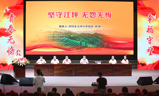 报告会上,“全国优秀教师”、邓村江坪小学校长郑林以《守望江坪无怨无悔》为题,深情讲述了她用专业引领农村孩子走进艺术殿堂,用爱心帮助更多孩子追逐人生理想,用教育行动为学校发展奉献力量的感人故事。江坪小学特聘岗位教师谭兆钦、江坪小学毕业生张俊瑶、郑林家属刘华娇、江坪小学学生家长张吉林、江坪小学青年教师史长艳分别深情讲述了郑林扎根偏远地区,全身心投入山区教育事业,以赤子之心、仁爱之心、守业之志,点亮茶乡农家孩子的求学梦,示范带动更多人开展支教助学的先进事迹、高尚师德和人格魅力。