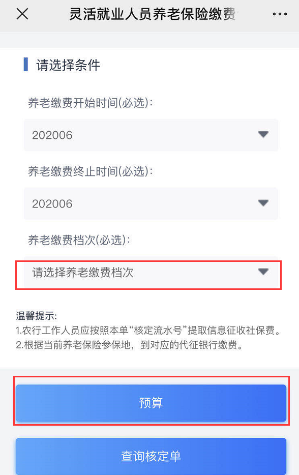 ③选择“养老缴费档次”进行“预算”,确认金额后“提交”,出现电子缴费认定单的图片。