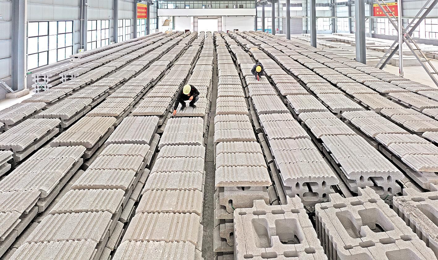 5月25日,宜昌市夷陵区龙泉小微创业园,昌耀新材料股份有限公司工人在加工制作磷石膏新型建筑材料。磷石膏是磷酸生产中用硫酸处理磷矿时产生的固体废渣,主要成分为硫酸钙。昌耀新材料股份有限公司与武汉理工大学组建磷石膏研究团队,从2015年起开始研发磷石膏综合利用新技术。2018年以来,陆续开发出了透水砖、路沿石、磷石膏路基材料和生态护坡产品四大新型建筑施工材料,每年可以“吃进”2万多吨磷石膏,“吐出”近亿元经济效益。 (湖北日报全媒记者 刘曙松 通讯员 张国荣 李重庆 摄)