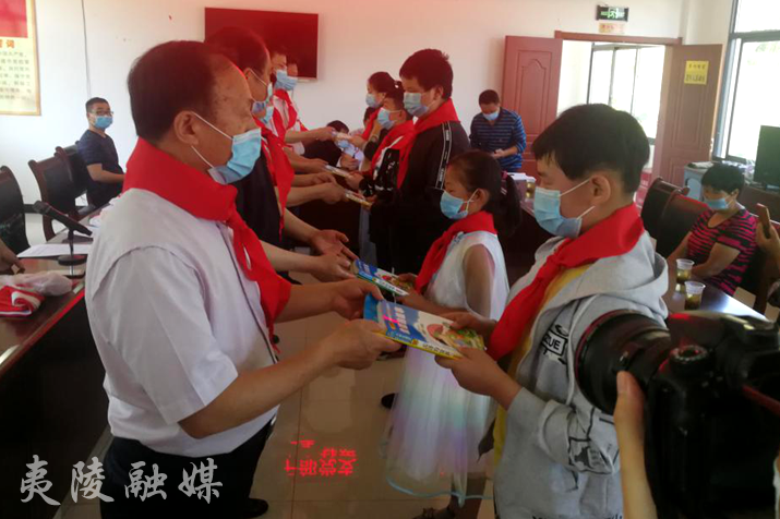 活动中,老干部代表与6名留守儿童互戴红领巾,赠送《雷锋的故事》和垃圾分类等书籍,发放口罩、消毒液等物资,捐献爱心款2400元,为孩子们送上节日的祝福和关爱。