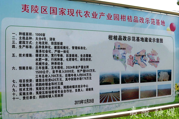 据了解,夷陵区国家现代农业产业园建设项目涵盖小溪塔街道、龙泉镇、鸦鹊岭镇,邓村乡、太平溪镇部分区域,区划总面积100万亩,总投资5.016亿元,其中包括近30万亩桔园。目前已启动万亩精品桔园、生态观光茶园等项目建设,在建精品桔园达到3800亩。