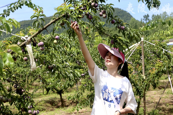 7月3日,天气晴朗,不时有游客到果园采摘。龙小琴是一名重庆妹子,跟亲戚一起慕名前来,她是第一次到夷陵区,也是第一次看到粉紫色的李子,“我们老家的李子都是青的,没有这里的李子漂亮,我就摘了一个,口味还蛮甜,脆脆的、蛮好吃。”穿梭于果园中,少女的笑脸与粉紫色的李子相映成趣,而那爽朗的笑声则让寂静的果园霎时间充满了生气与活力。