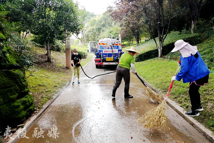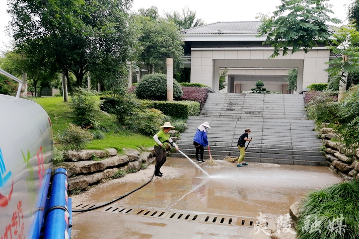 由于城区积水多为雨水与地下管网外溢水混合形成,存在病原微生物,为确保城区公园环境卫生安全,夷陵区园林中心组织管理人员及绿化作业人员共68人,对城区各公园道路淤泥、栈道泥沙、黄柏河沿岸白色垃圾等区域进行清理冲洗,共清理泥沙及黄柏河沿岸白色垃圾约38吨,清除滑坡土石3车。同时,对公园沿河栈道、公厕内外及周边、园内道路、健身器材、垃圾分类箱等公共区域进行消杀灭菌。此外,还对橡胶坝泵房控制室堆积的杂物进行清理、对其地面和操作柜等经常接触的表面使用消毒液擦拭、对橡胶坝被洪水淹没的周边进行消毒杀菌。