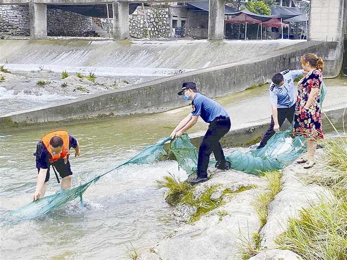 执法人员在下牢溪开展联合执法检查,现场收缴地笼网具