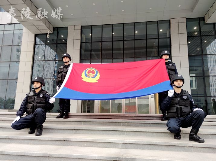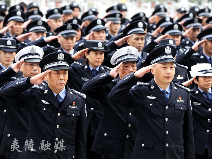 “敬礼——”人民警察们整齐列队,向鲜艳庄严的警旗致敬。雄壮的乐曲声中,人民警察齐唱警歌。
