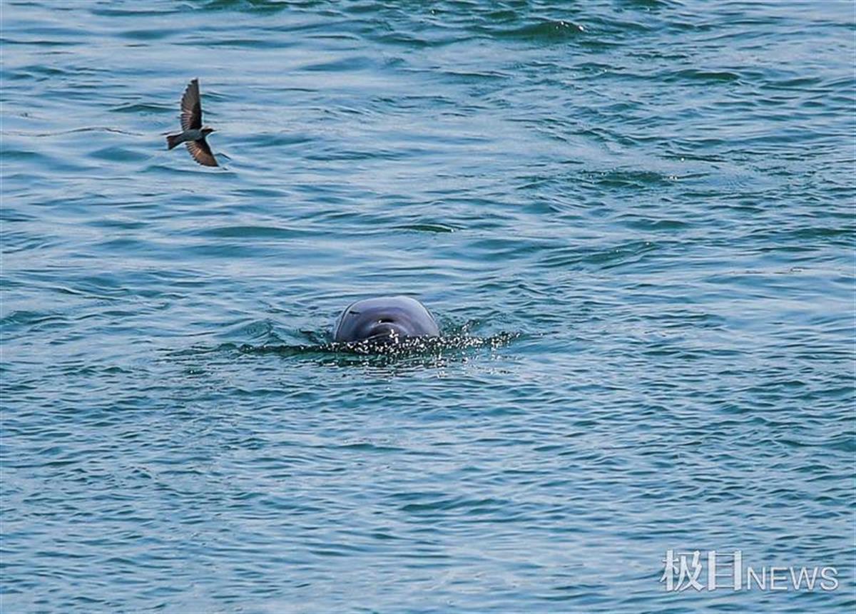 江豚正在捕捉小鱼,小鸟也想分享