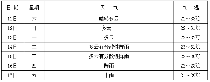 未来一周(9月11-17日)我区前晴后雨,气温前高后低。其中11-13日以多云天气为主;14-15日多云有分散性阵雨,局部伴有雷电、短时强降水等对流性天气;16-17日有中等强度降水过程发生。具体预报如下: