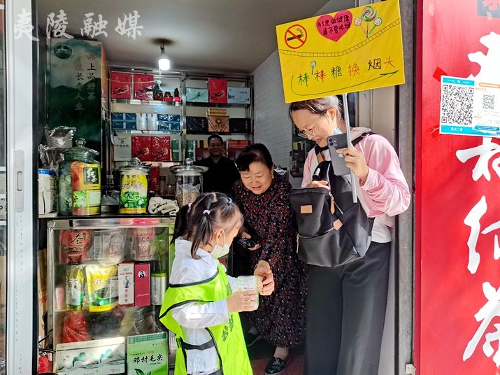 孩子们劝导市民不在公众场所吸烟、不乱扔烟头、文明出行,用手里的棒棒糖交换市民手中的烟头,以实际行动号召广大市民礼貌举止、文明言行,共同参与文明典范城市创建。不少市民表示:“孩子们说的对,吸烟不仅有害健康,而且影响公共场所的环境卫生,以后要养成好习惯,少抽烟、不乱丢烟头。”