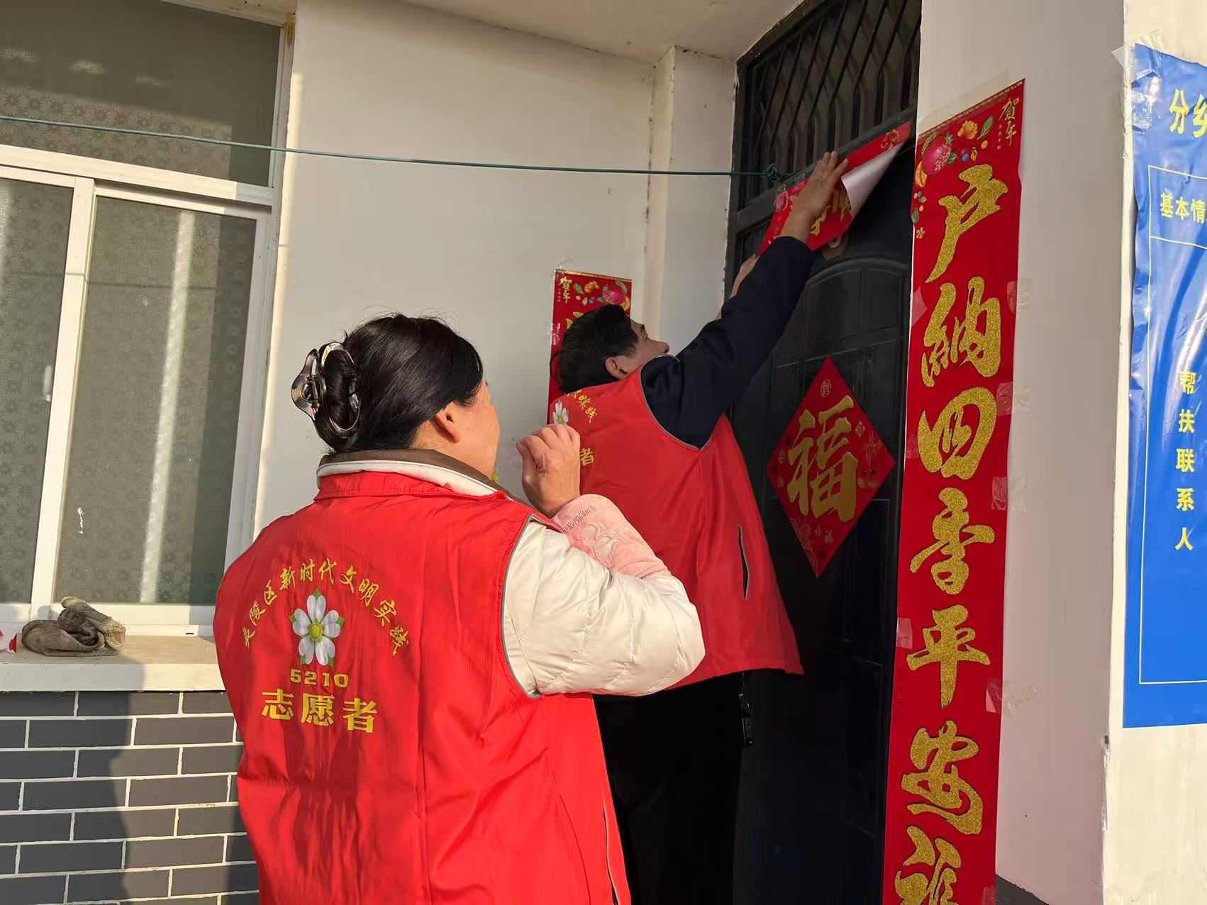 会后,全体成员立即投入“清洁家园”行动。在集中安置点,大家捡垃圾、除杂草、贴春联,用劳动迎接新春。红彤彤的对联映照着笑脸,整洁的村道展现新貌。