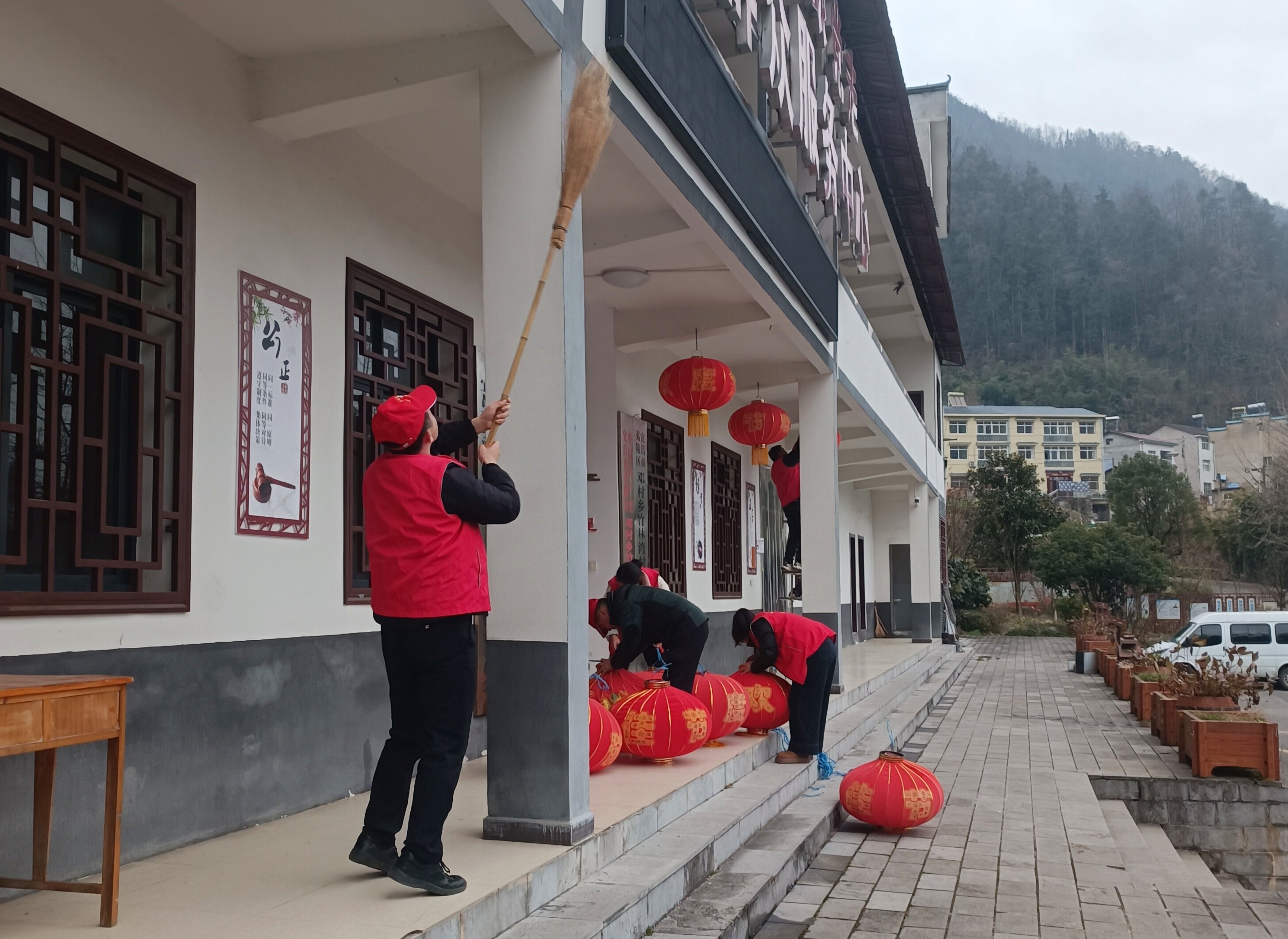 活动中,志愿者们手持清洁工具,对村委会周边道路、文化广场、便民服务中心等公共区域进行了全面清扫,重点清理了卫生死角与杂物。劳动结束后,大家齐动手,在村委会办公楼前挂起了一串串红灯笼。点点红色错落点缀,不仅美化了村庄环境,更映衬出浓浓的节日气氛。