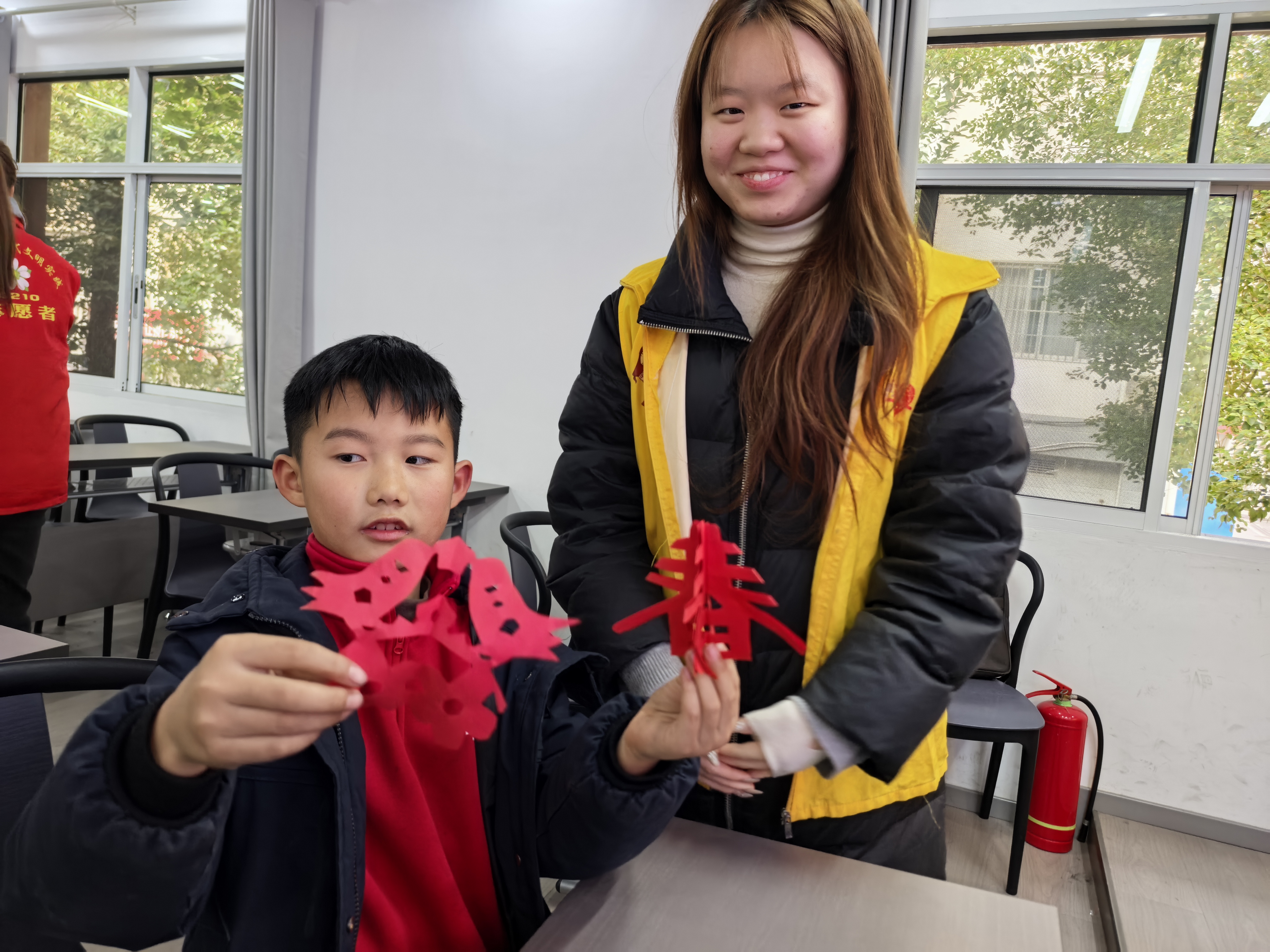 2月6日下午,小溪塔街道东湖社区爱心托管班内,红纸翻飞、笑语盈盈,大学生志愿者杜佳谊为孩子们带来了一堂趣味十足的民俗剪纸体验课。