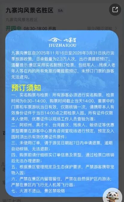 四川九寨沟景区每日限流2.3万人,门票最早可提前14天预订。