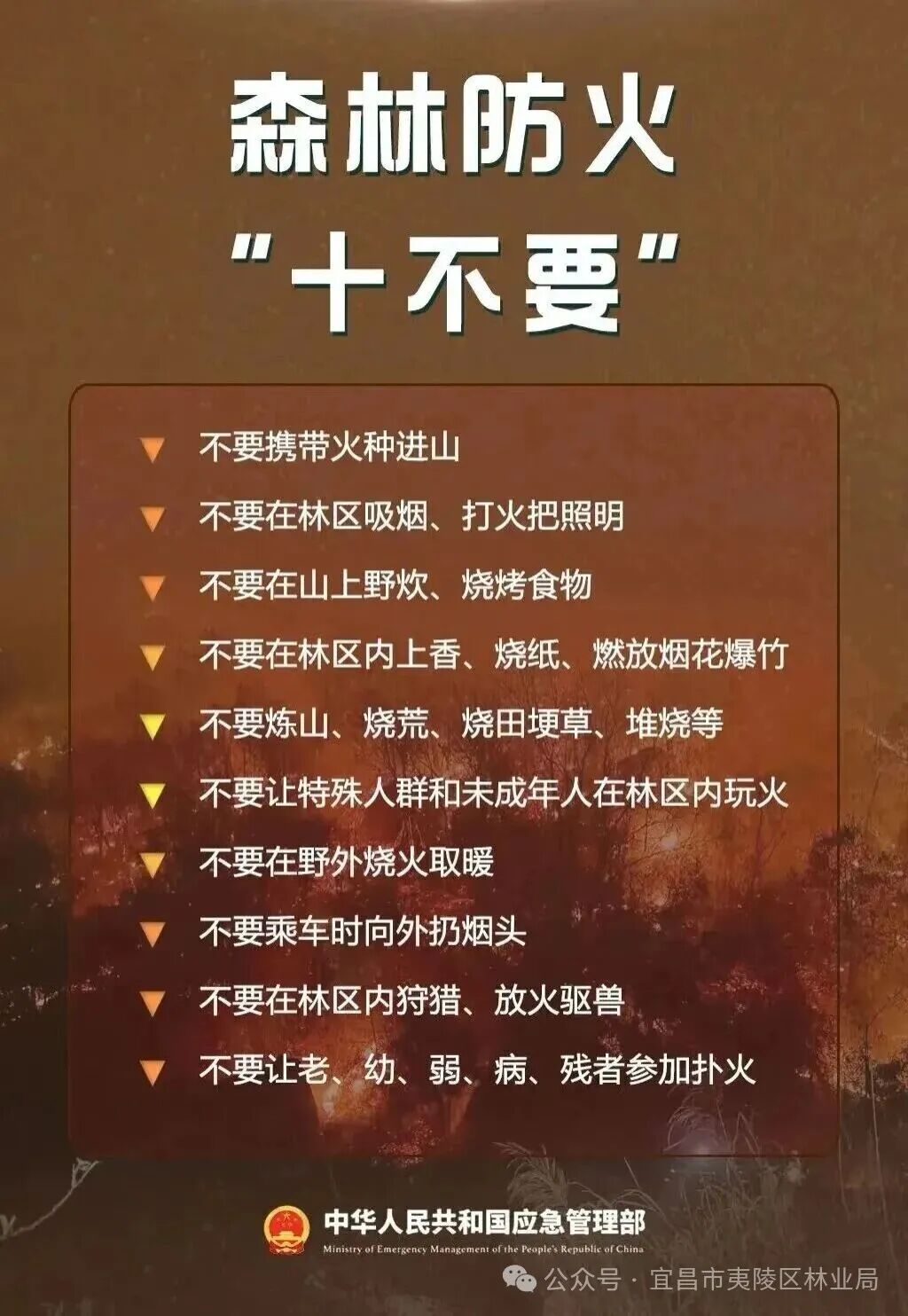 严守“十不准”,不越安全线。森林防火区严禁一切未经批准的野外用火。请务必牢记“十不要”: