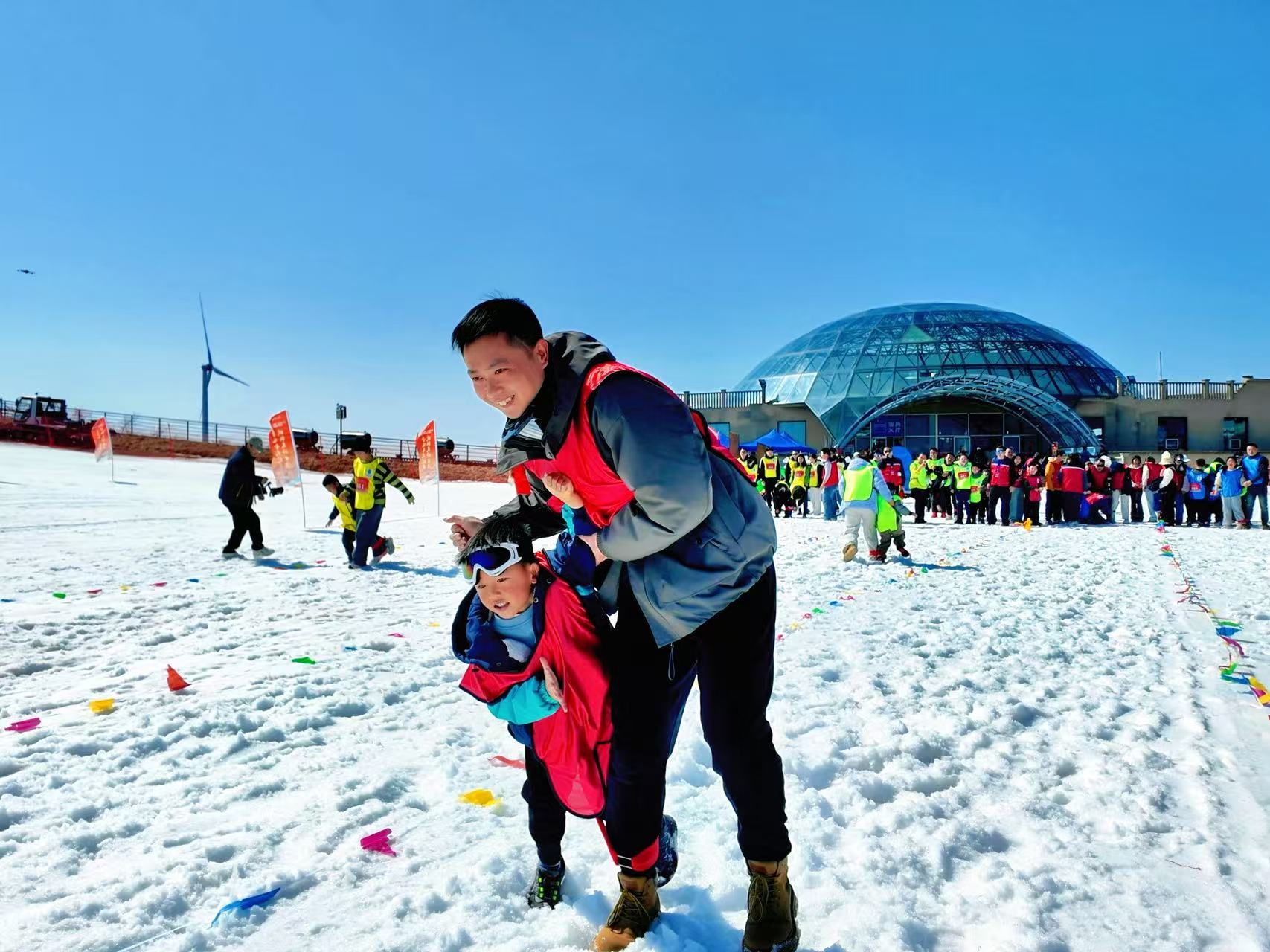 在亲子运动区,雪地两人三腿跑、亲子滑雪圈竞速等项目吸引了不少家庭参与。孩子们坐在雪圈里从滑道飞驰而下,家长们则在终点张开双臂,迎接一个个“小雪球”冲进怀里,笑声此起彼伏。