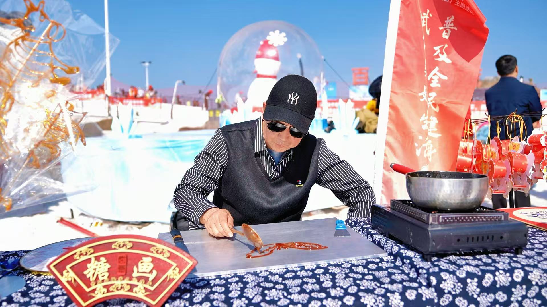与往年不同,今年的活动现场特别设置了非物质文化遗产展示区,成为一道亮丽的文化风景线。夷陵版画的传承人正执刀刻版,一幅幅展现峡江风情的作品跃然纸上;糖画摊前围满了孩子,传承人舀起一勺热糖,手腕翻飞间,一只晶莹剔透的蝴蝶便在案板上“飞舞”起来;面人师傅指尖生花,揉搓捏塑之间,冬奥吉祥物、十二生肖便活灵活现地呈现在掌心。许多参加完雪地项目的孩子顾不上摘下护具,就拉着家长跑来体验,在冰雪世界中感受传统文化的独特魅力。
