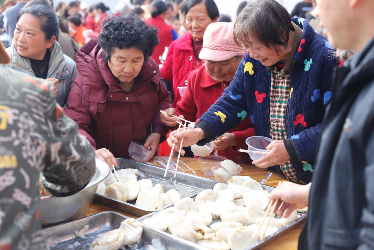活动现场还设置了毛果团子免费品尝区,这道承载着宜昌非遗记忆的传统美食,是白庙村人元宵节不可或缺的味道。现场制作的毛果团子,外皮由糯米粉等原料精心调制,软糯筋道,内馅包裹着腊肉丁、豆干、蒜苗等鲜香食材,香气浓郁。村民们有序排队,领取这份热气腾腾的美味,大家一边品尝美食,一边畅谈家常,现场处处洋溢着温馨和谐的氛围。