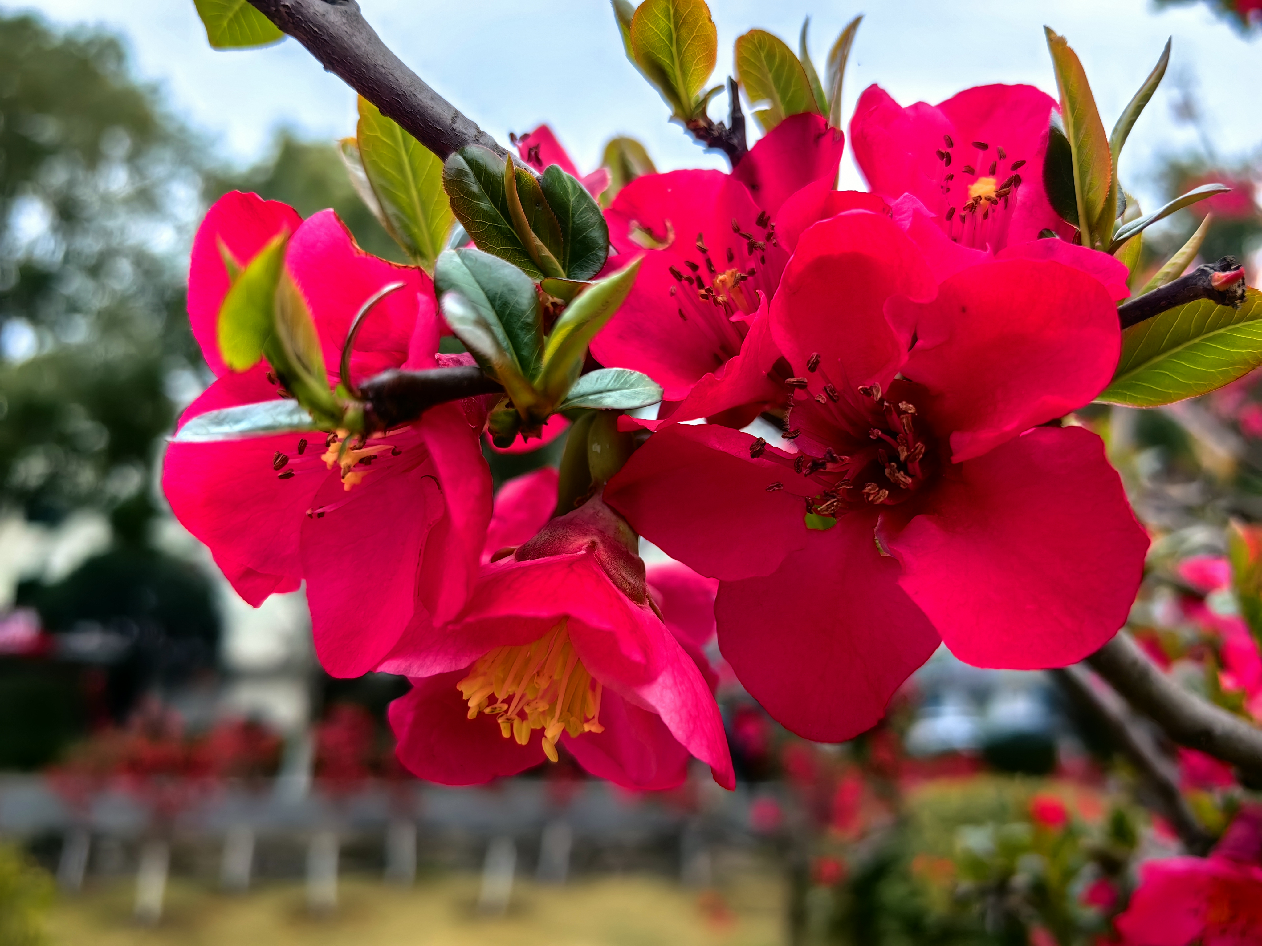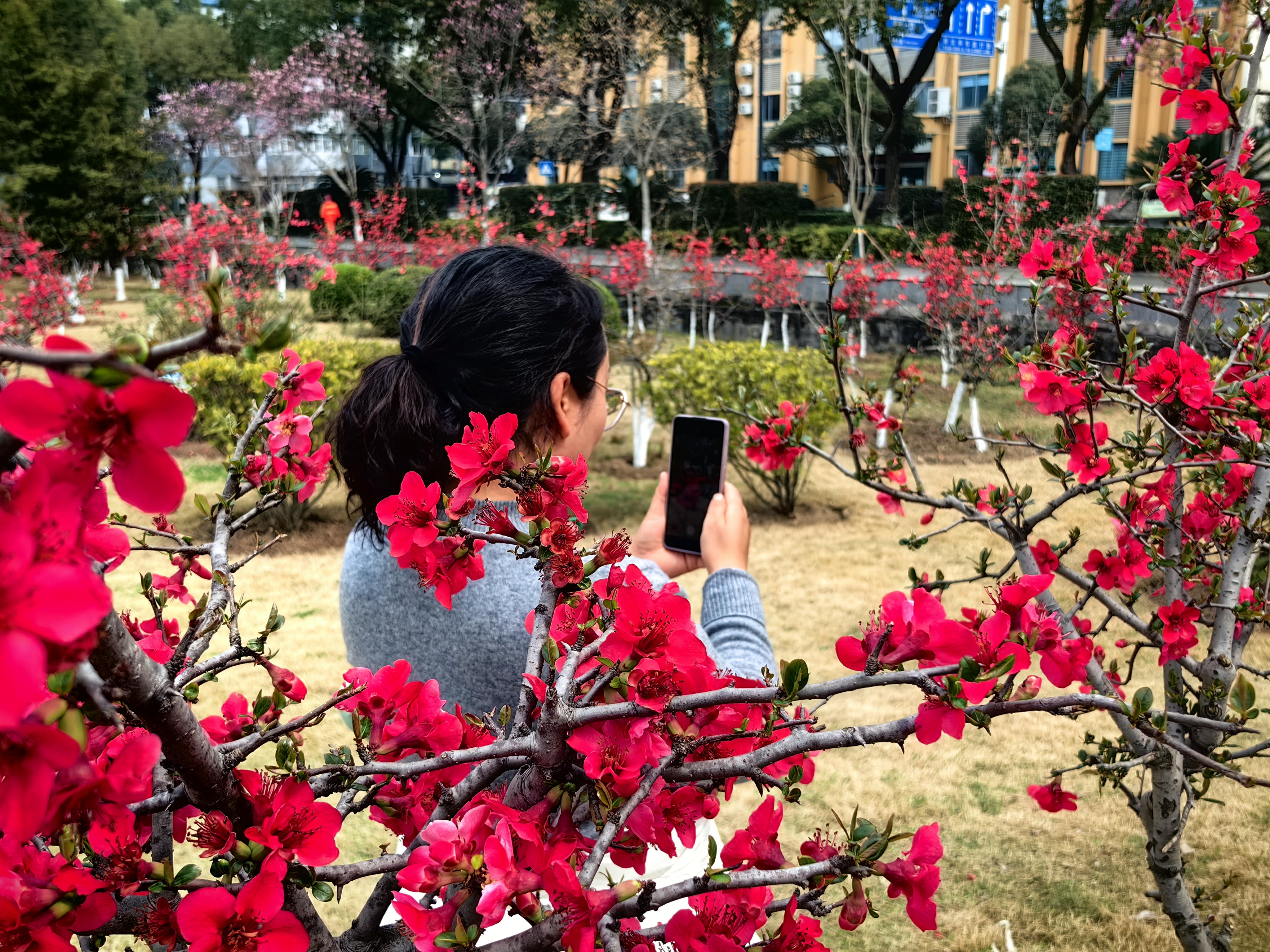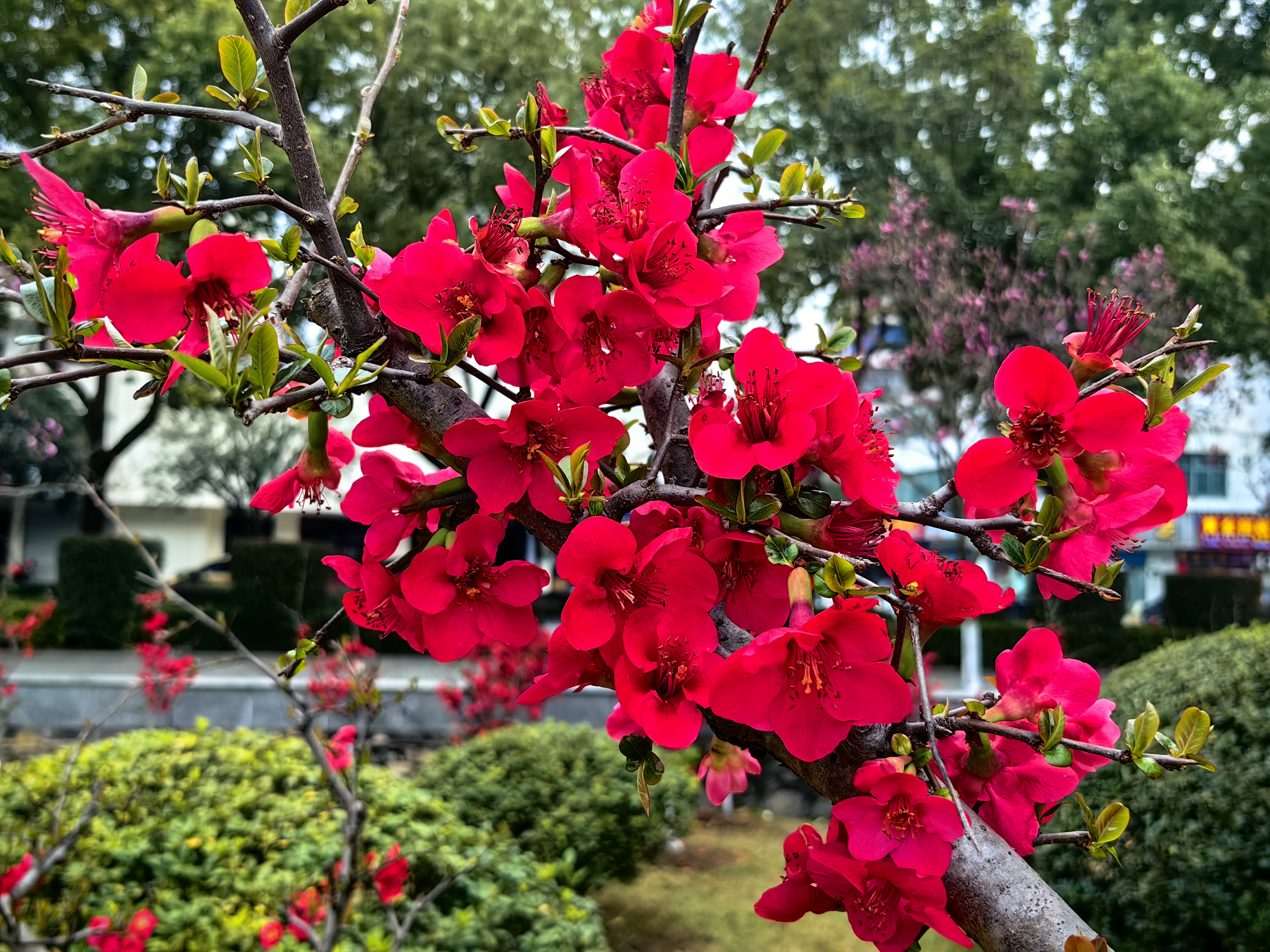 连日来,气温回暖、春意盎然,夷陵区滨河公园内,贴梗海棠迎来盛花期,千枝万蕊竞绽放,勾勒出春日里最明艳的画卷。