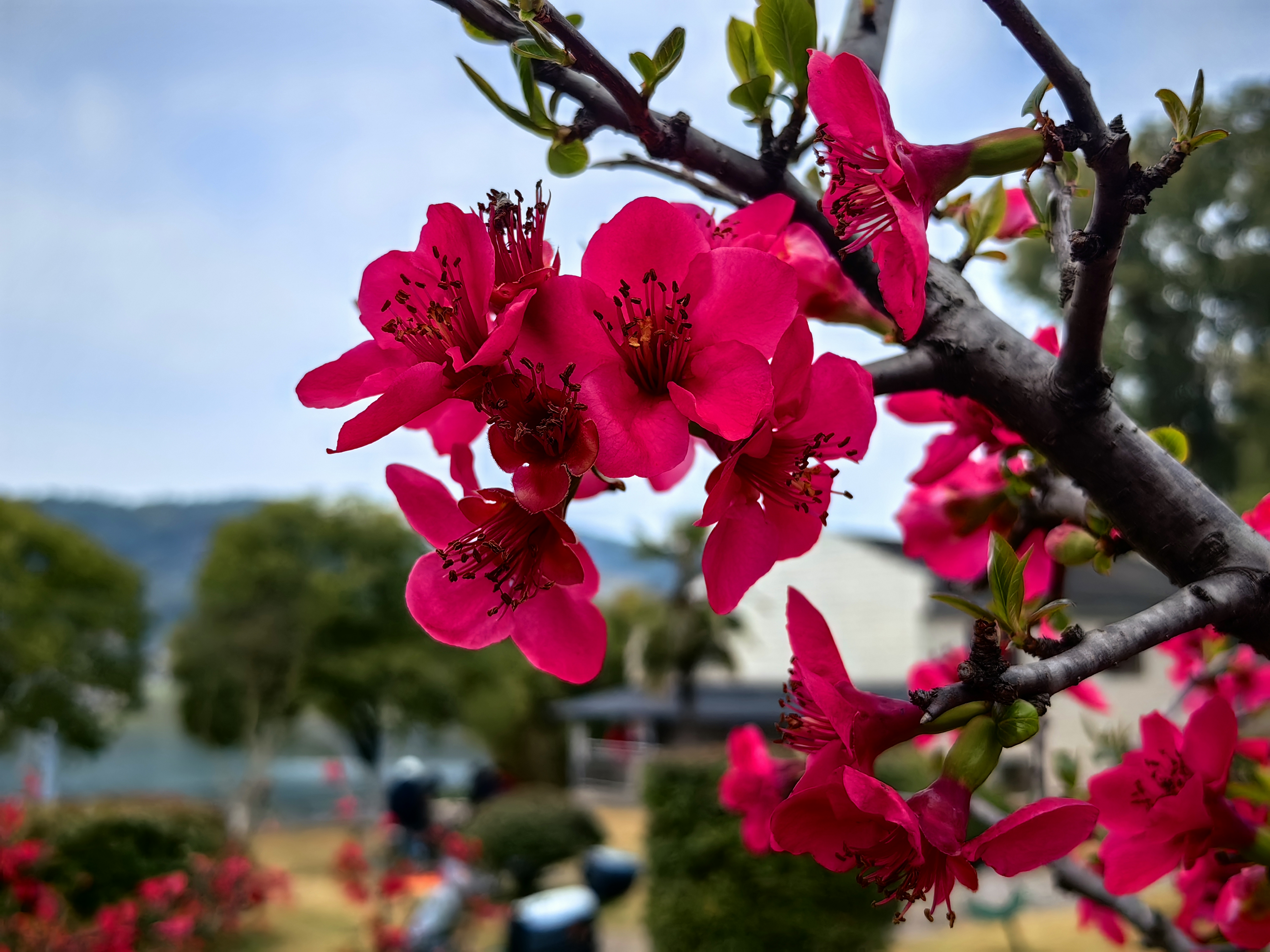 贴梗海棠缀满枝头,花朵紧依枝干,不见多余修饰。花色红得似火、粉得如霞,层层叠叠的花瓣透着温润光泽,在春风中轻轻颤动。暗香随风弥漫,瞬间唤醒了春日的气息。