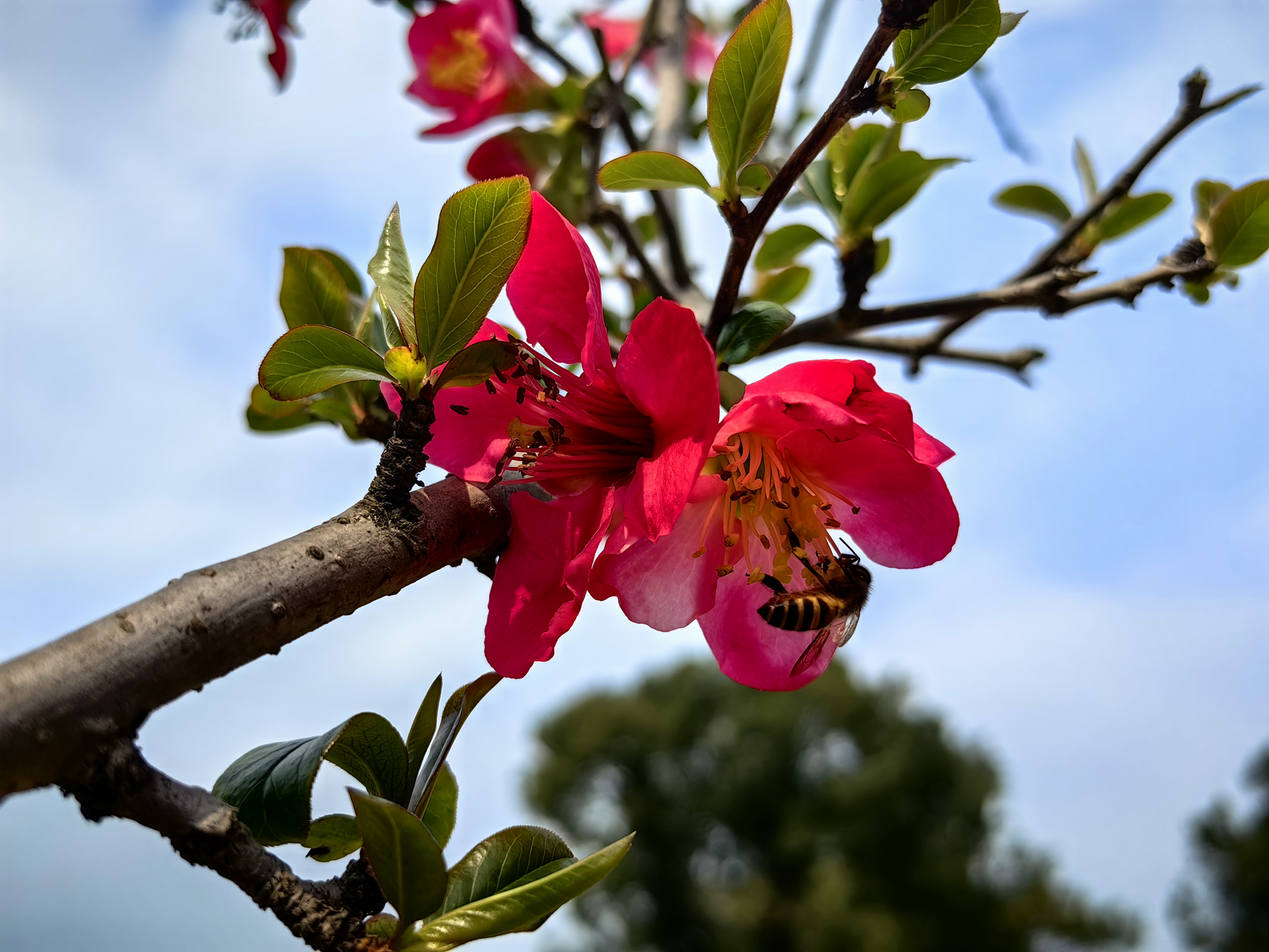 花间蜂影翩跹,蜜蜂嗡嗡穿梭,在厚实娇嫩的花瓣间采蜜,忙碌的身影为春日景致注入了灵动的生机。