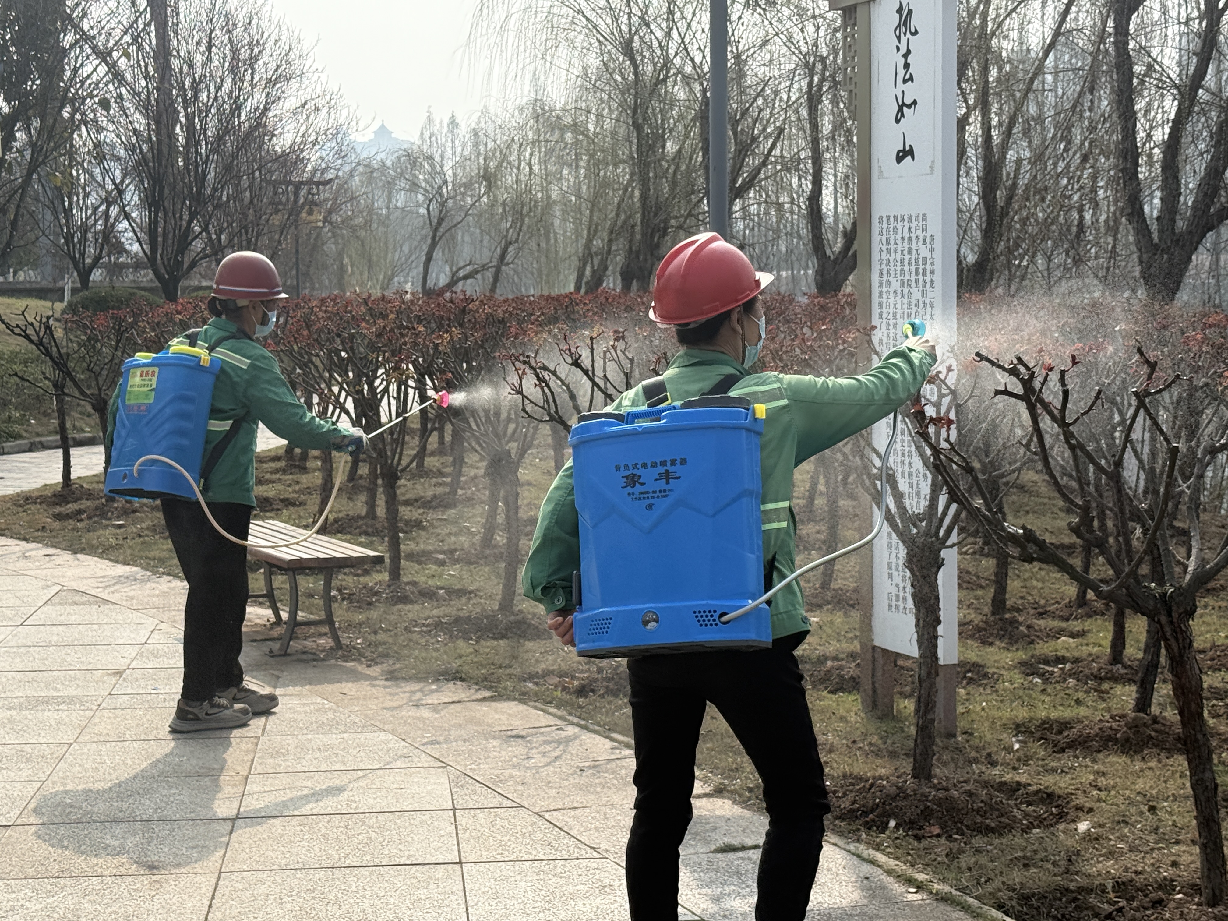 城区月季包含树桩月季、藤本月季、地被月季等多个品类,不同品种各有特色,盛花期将呈现出不同的观赏效果。为实现“全城爆花”的景观效果,园林工人制定了全流程专业养护方案,修剪环节逐株梳理残枝、弱枝、过密枝,按需调整藤本枝条牵引方向,保障植株通风透光,为花苞发育预留充足空间;施肥环节根据不同品种的生长需求定制营养配比,采用定点穴施的方式缓释养分,为花期供给充足能量;病虫害防治采用科学配比的药剂统一喷施,提前为月季做好病虫防护,避免花期受病虫害侵扰;浇灌则根据近期气温和土壤情况动态调整频次,既保证根部水分充足,又避免积水伤根。
