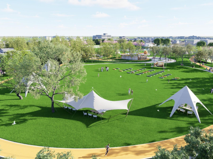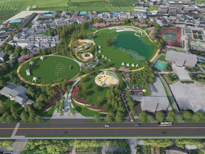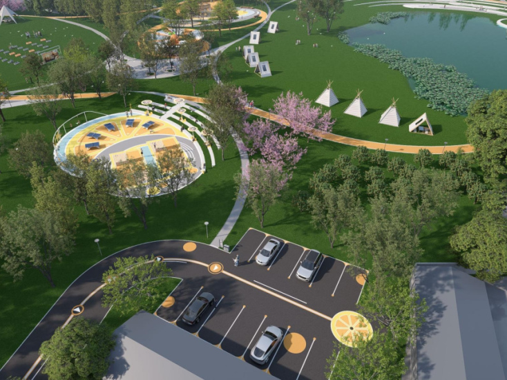 公园总占地约6.3万平米,其中超大草坪及绿化共4.5万平米、荷塘约6000平米,配套175个停车位及1处公厕,中心设桔子驿站及多元游乐设施,是一处全龄段、多功能的综合性城市公园。
