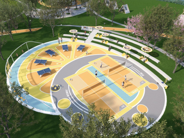 2.运动区🏸:配备2处羽毛球场、5处乒乓球场、设置有儿童游乐设施,可举办社区体育联赛、业余锦标赛、潮流运动体验、青少年体育培训等; 公园外设篮球场、足球场、塑胶跑道,运动体验丰富;