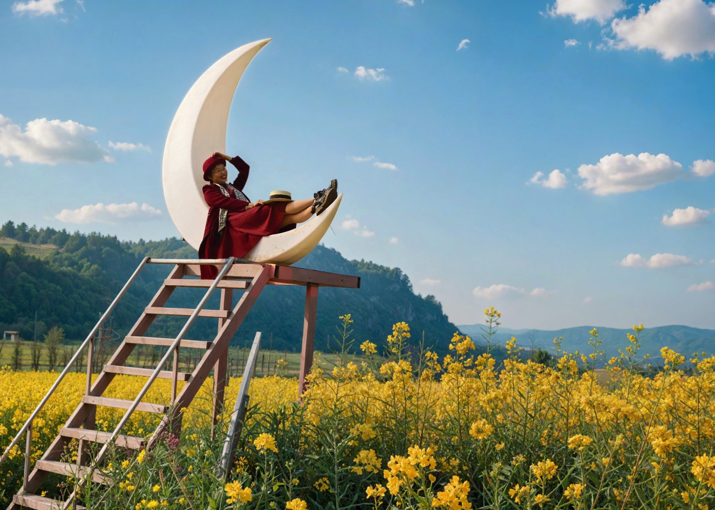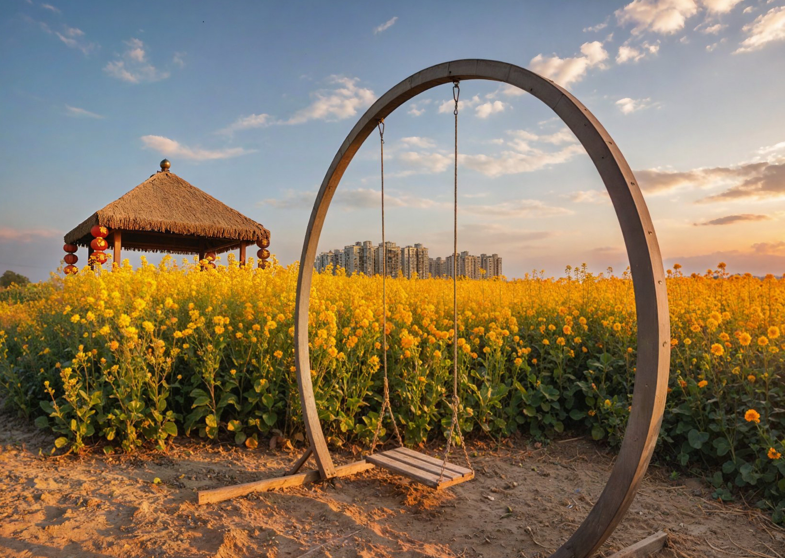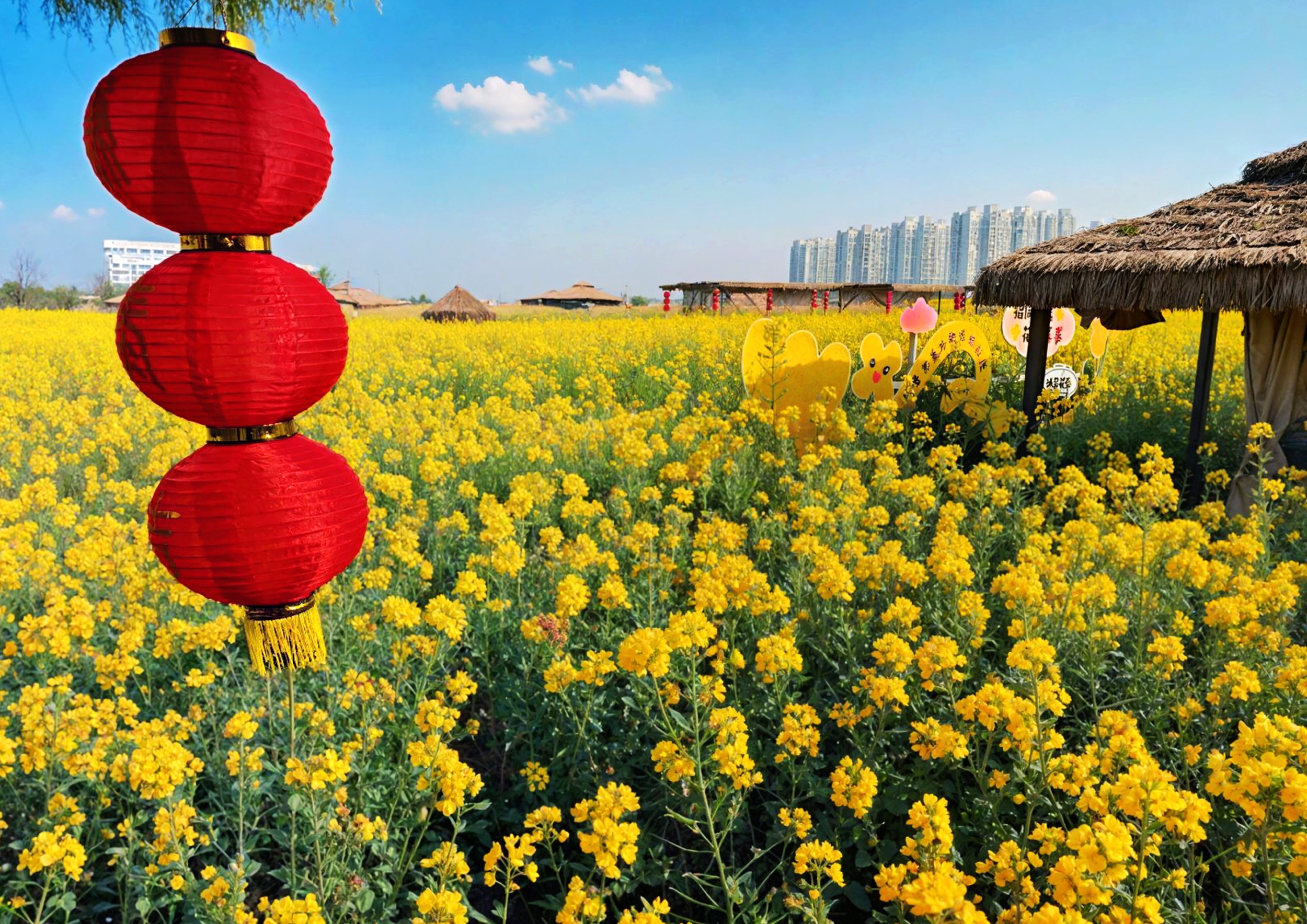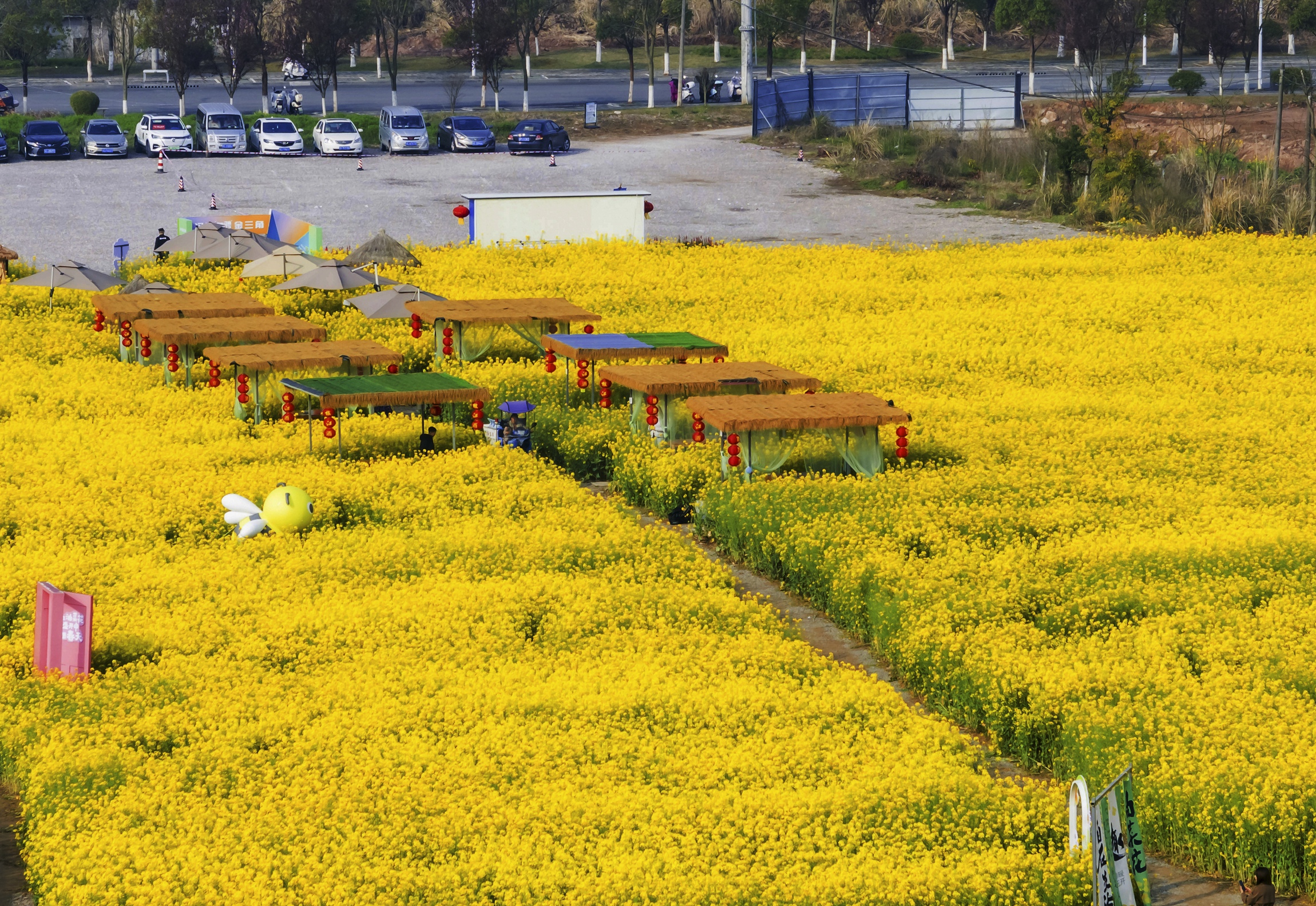 恰逢周末,不少游客早早驱车前往打卡。花田内,创意“空中月亮”等网红打卡点前排起长队,游人手持相机、手机定格春日瞬间。身着鲜艳服饰的游客在花海中穿梭,欢声笑语回荡在田野。
