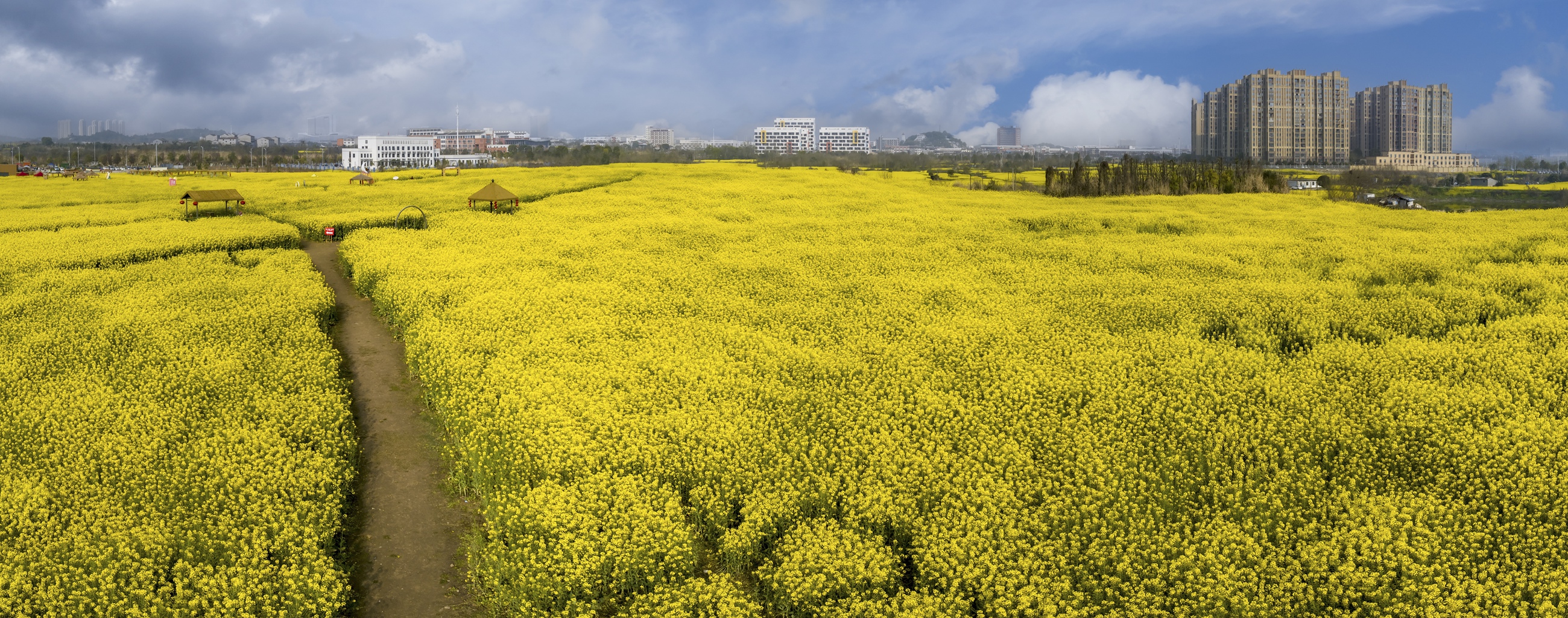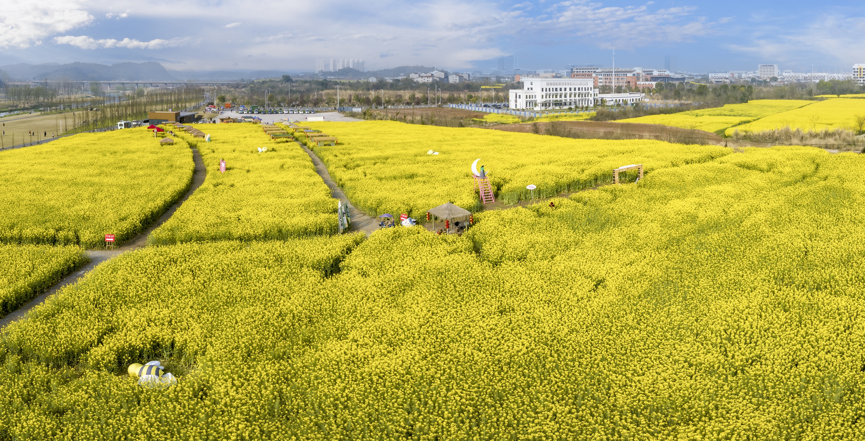 据悉,柏临河生态湿地公园依托近4万平方米的油菜花海,打造了系列创意景观。当地还配套了花田市集、休闲步道等设施,让游客在赏景之余感受乡村休闲氛围,生态湿地正成为夷陵春日文旅新热点。