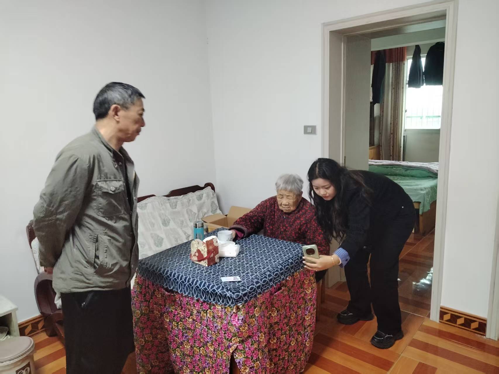 在上门服务过程中,工作人员耐心细致地为老人讲解认证流程,手把手帮助老人完成操作。面对没有智能手机的老人,工作人员则用自己的手机,俯下身子,一步步协助其核对信息、完成认证,让老人们足不出户就能享受到贴心的服务。