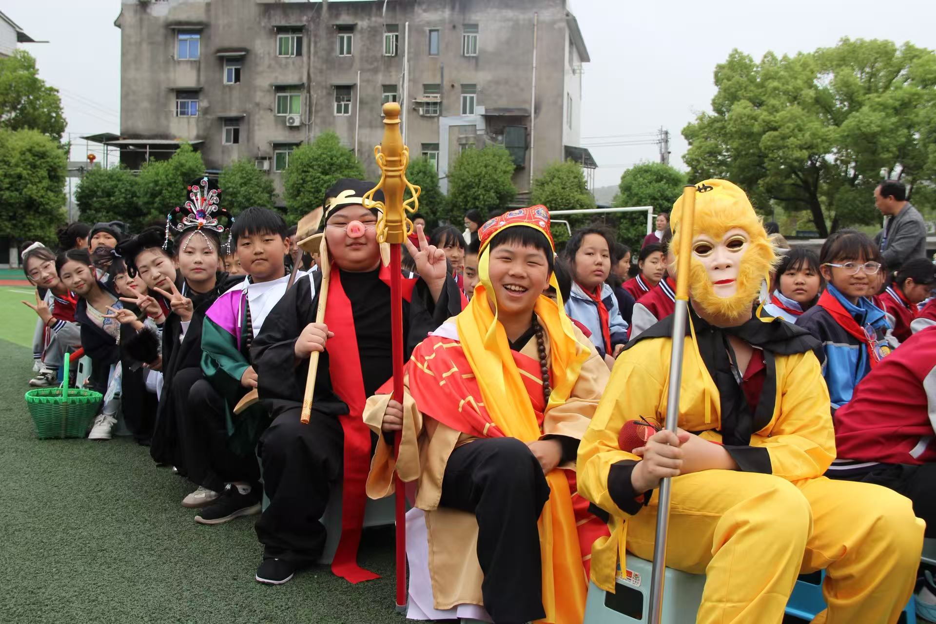 主题展演各班精彩纷呈,经典诵读、课本剧节目轮番上演。一年级萌娃稚嫩吟唱《春晓》尽显春日意趣,五年级改编《三打白骨精》《武松打虎》,把经典演得鲜活生动,六年级还原《两小儿辩日》的争辩场景藏着对古人文本的细腻理解。游园环节更是热闹非凡,低年级考诗词背诵、中年级重阅读理解、高年级开展名著知识比拼,“挥毫泼墨”“活字印刷”等传统文化体验区人气高涨,学生们在游戏中感受文化魅力,在闯关中收获阅读乐趣。