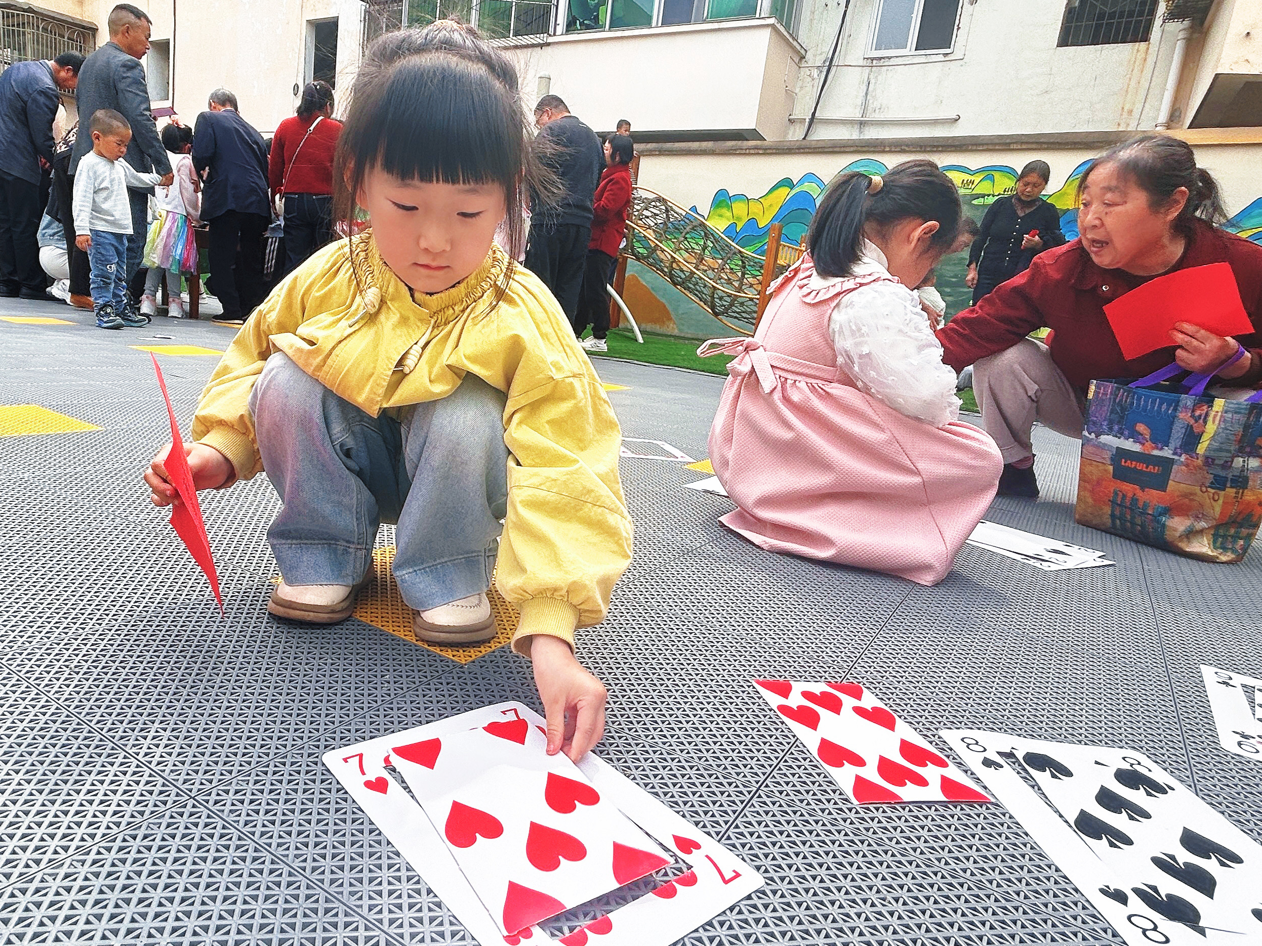 在数学游戏游园会环节,幼儿园精心设置玩转扑克牌、小小测量师、美丽彩虹雨等8个趣味游戏,涵盖分类、数物对应、图形认知、空间方位、测量、计算等数学核心经验,让孩子们在探索与动手操作中感受数学的实用与美妙,真正实现“玩中学、做中学”。