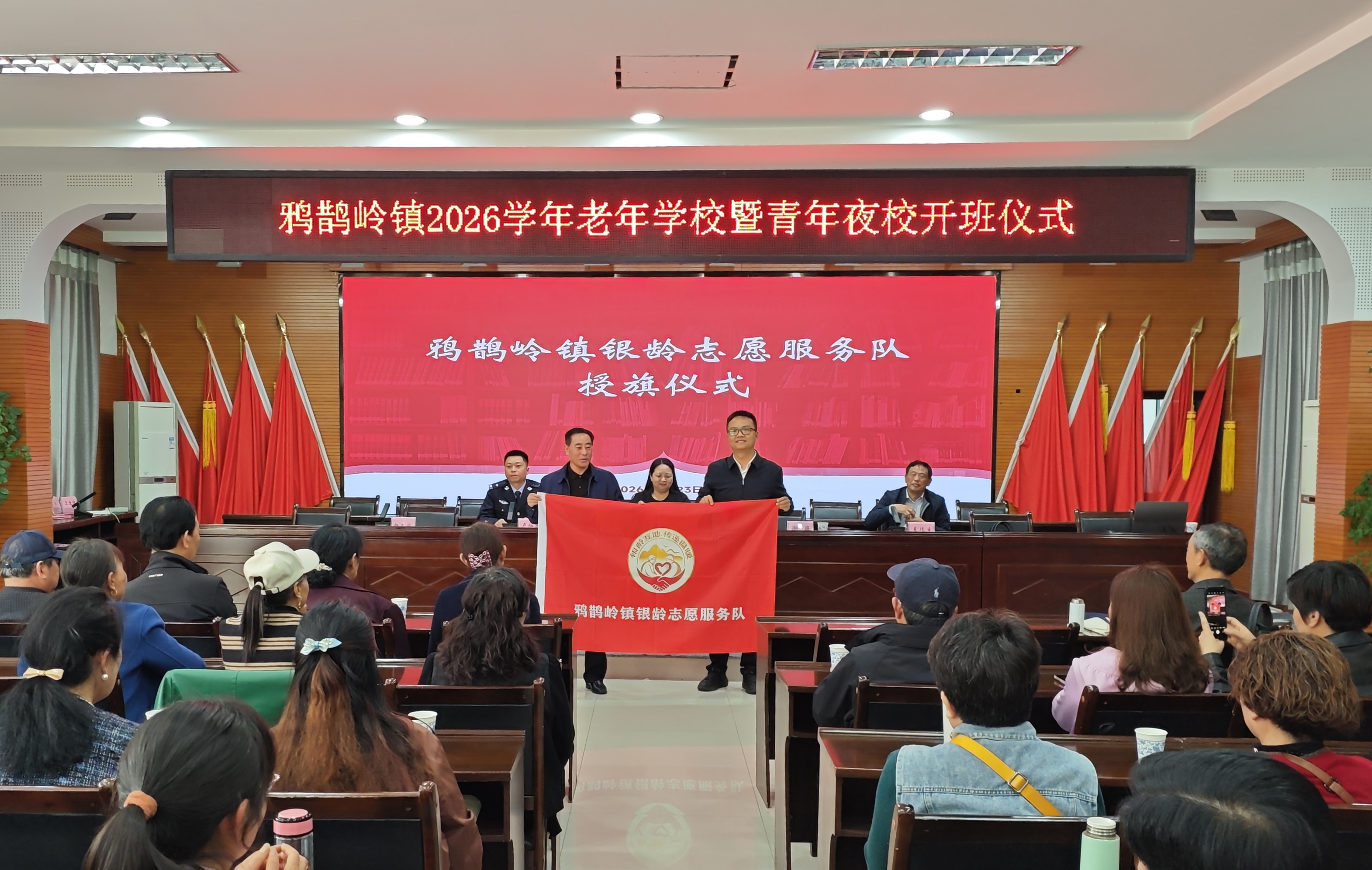 4月23日,鸦鹊岭镇2026学年老年学校暨青年夜校开班仪式举行,镇老年学校全体教师、学员及青年干部代表共100余人齐聚一堂,共同迎接新学年的到来。